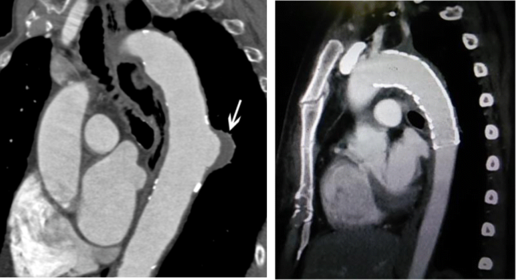 Il existe de nombreuses raisons pouvant expliquer la présence d’un anévrisme au niveau de l’aorte thoracique descendante. La cause principalement retrouvée en est l’athérosclérose. Ces anévrismes sont rarement symptomatiques et le diagnostic est souvent fortuit lors de la réalisation d’un scanner thoracique.